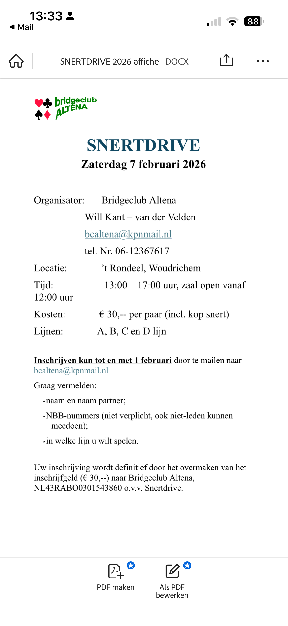 BC Altena nodigt u van harte uit voor onze jaarlijkse ´Snertdrive' Dit evenement is op 7 februari 2026 en vindt plaats in ´'t Rondeel in Woudrichem, aanvang 13.00 uur. Bij aanmelding graag vermelding van uw naam, naam partner en speelsterkte. Per paar is het inschrijfgeld € 30.- Uw betaling graag vooraf voldaan via NL43RABO0301543860 o.v.v ´snertdrive ´ We zien uit naar uw komst!